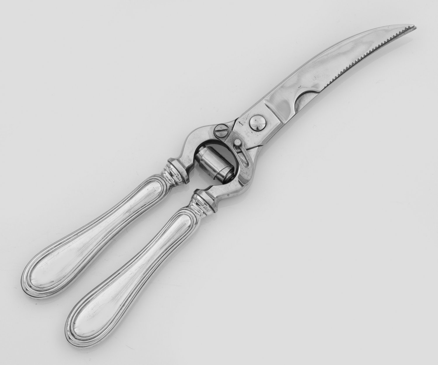 Geflügelschere Silber und Edelstahl. Leicht gebogte Klingen, übergehend in randprofilierte Griffe. Modell Schwedisch Faden. Gest. 800, Herstellerzeichen. L. 27 cm. An Italian silver and stainless steel poultry pliers. Standard mark 800, maker´s mark. Italien. Padua. 20. Jh.