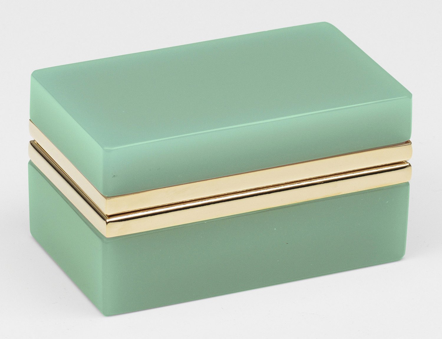 Art Déco-Dose Rechteckig. Mintgrünes, geschliffenes und poliertes Opalglas. Scharnierte Messingmontierung. H. 6 cm. 11 cm x 6,5 cm.A French Art Deco cut and polished mint green glass box with brass-mounted hinged cover.Frankreich. Um 1930-1940.