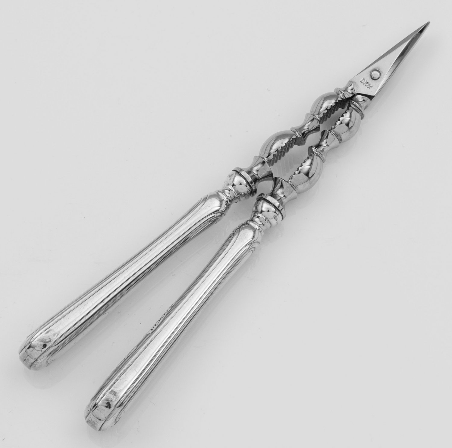 Schalentierzange Silber und Edelstahl. Spitz zulaufende Zange mit Einkerbungen zum Fixieren, übergehend in randprofilierten Griff. Modell Schwedisch Faden. Gest. 800, Herstellerzeichen. L. 20,5 cm.