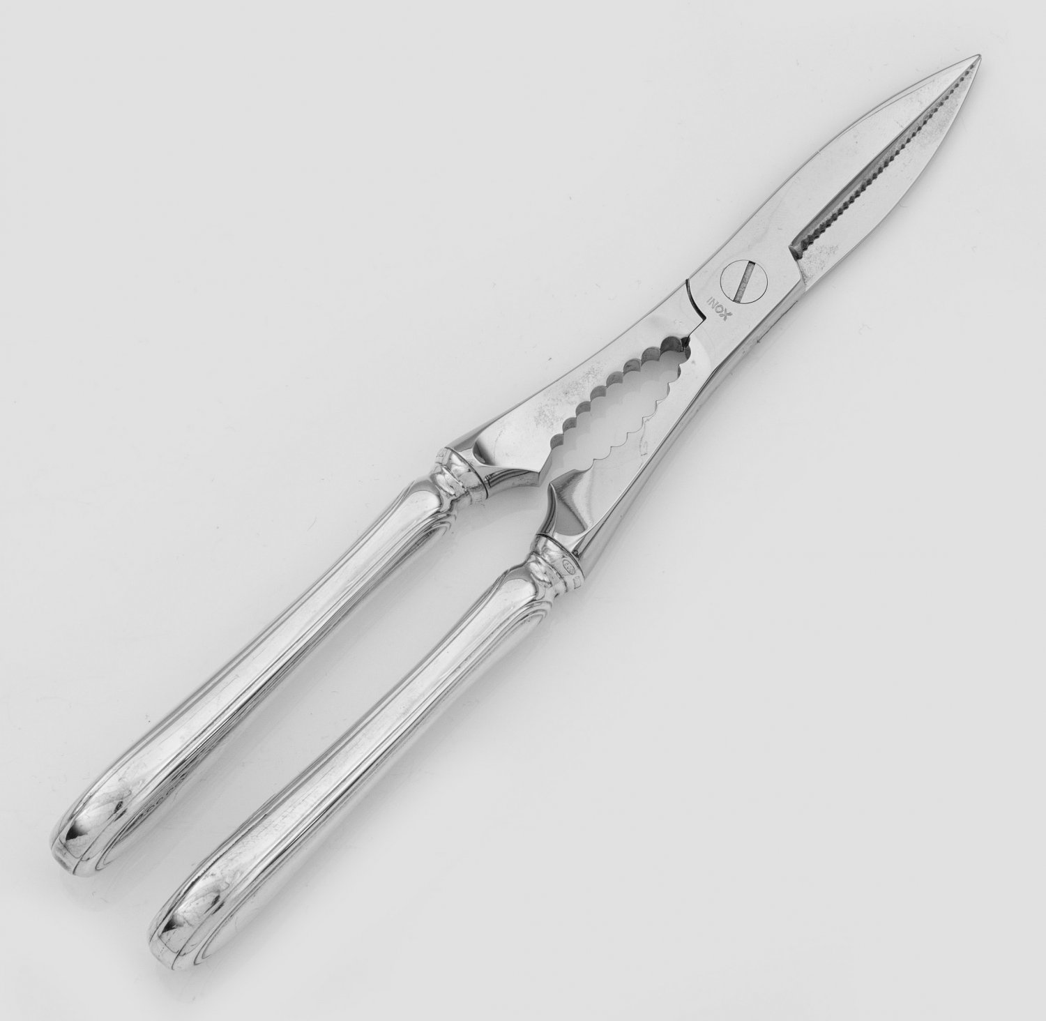 Hummerzange Silber und Edelstahl. Randprofilierte Griffe. Modell Schwedisch Faden. Gest. 800, Herstellerzeichen. L. 21,5 cm.An Italian silver and stainless steel lobster tongs. Standard mark 800, maker´s mark.Italien. Padua. 20. Jh.