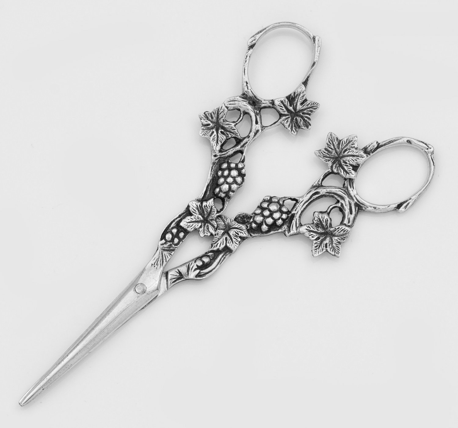 Traubenschere Silber. Silbergriffe mit plastischen Weintrauben und Weinlaub. Gest. 925. Gew. ca. 50 g. L. 14,5 cm. A decorative Sterling silver scissors.Sterling-Silber. 20. Jh.