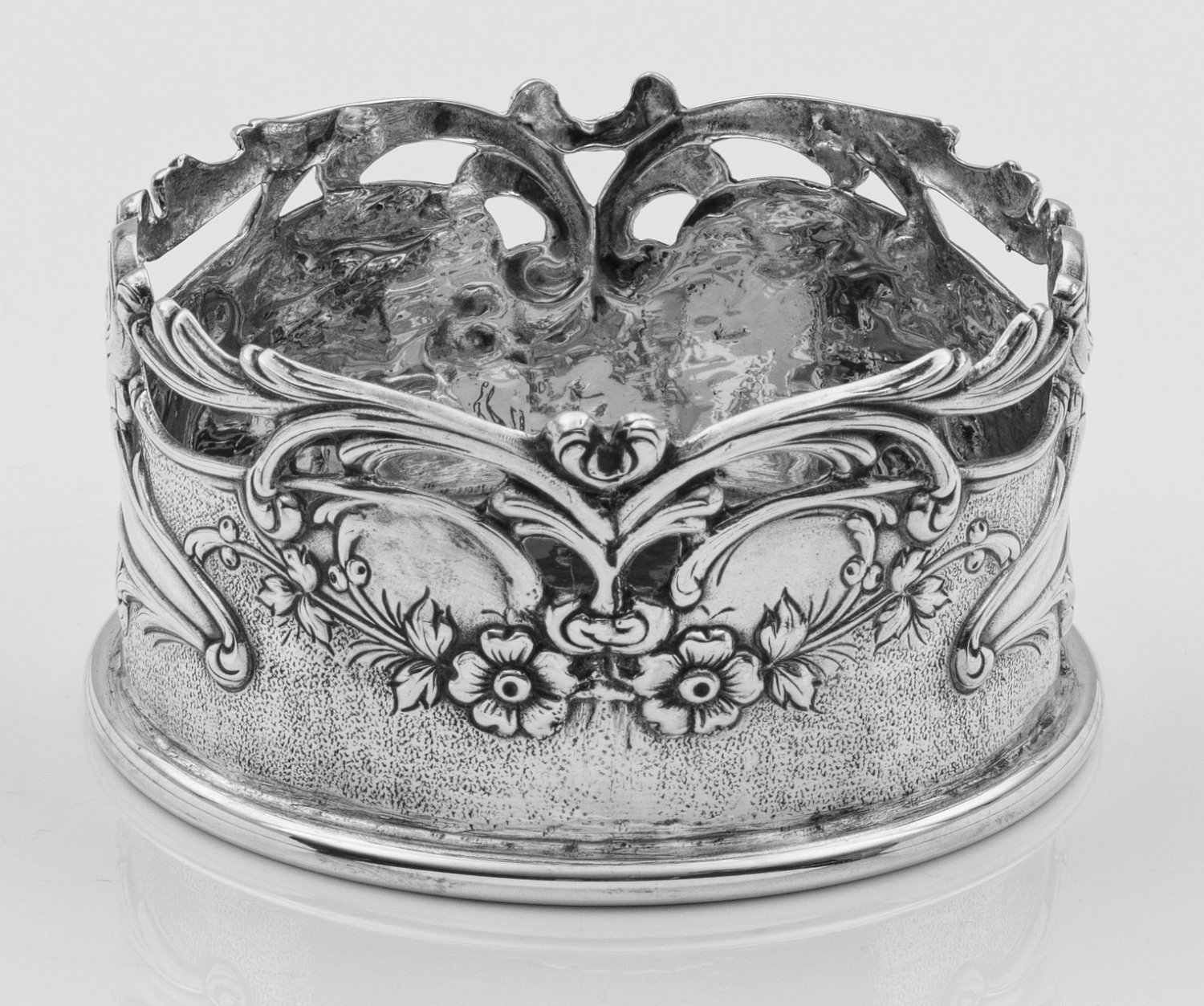 Flaschenuntersetzer Silber. Zylindrische, durchbrochen gearbeitete Wandung, umzogen von reliefplastischen Blattranken und Blüten. Gest. 800. Gew. ca. 190 g. D. 9,5 cm.A German silver bottle stand. Standard mark 800.Deutsch. 20. Jh.
