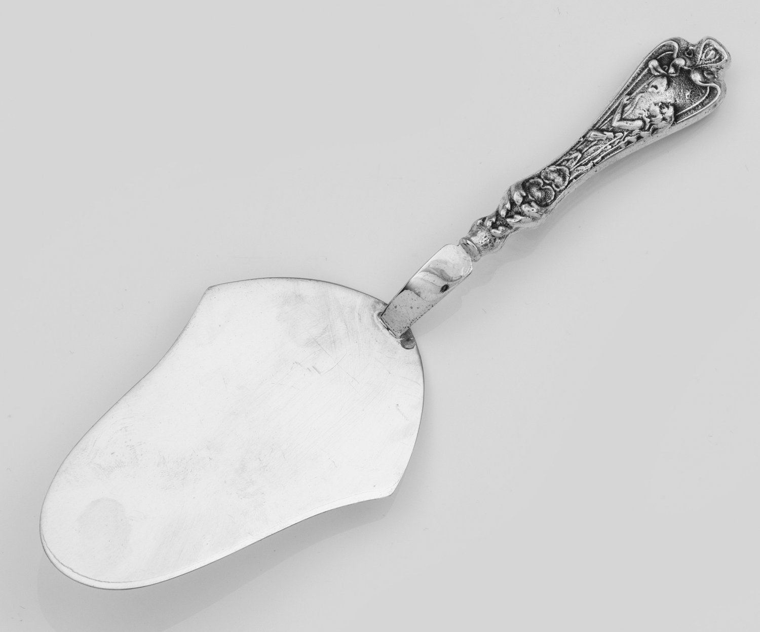 Kuchenheber Silber. Geschweifter Heber. Auf dem Griff reliefplastische Darstellung einer Frau sowie Blüten im Jugendstil. Gest. 925. Gew. ca. 80 g. L. 20 cm.A Sterling silver cake lifter. Standard mark 925.Sterling-Silber. 20. Jh.