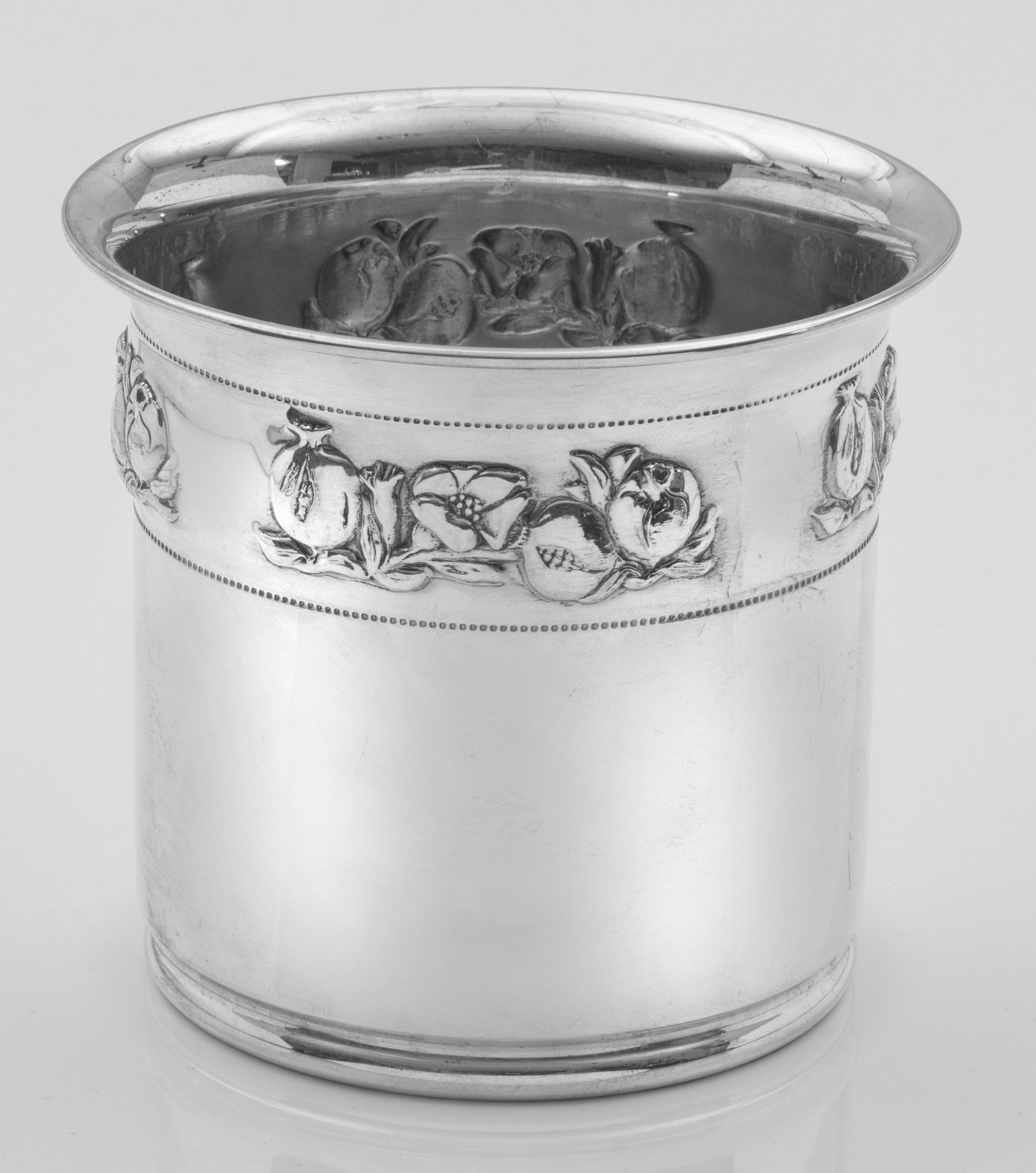Weinkühler Silber. Konischer, zum Rand hin ausschwingender Korpus mit leicht gekehltem Stand. Unterhalb des Lippenrandes vier plastisch gearbeitete Reliefs in Form von Blüten und Granatäpfeln. Gest. 925, undeutl. Herstellerzeichen. Gew. 324 g. H. 12,5 cm. D. 13,5 cm.