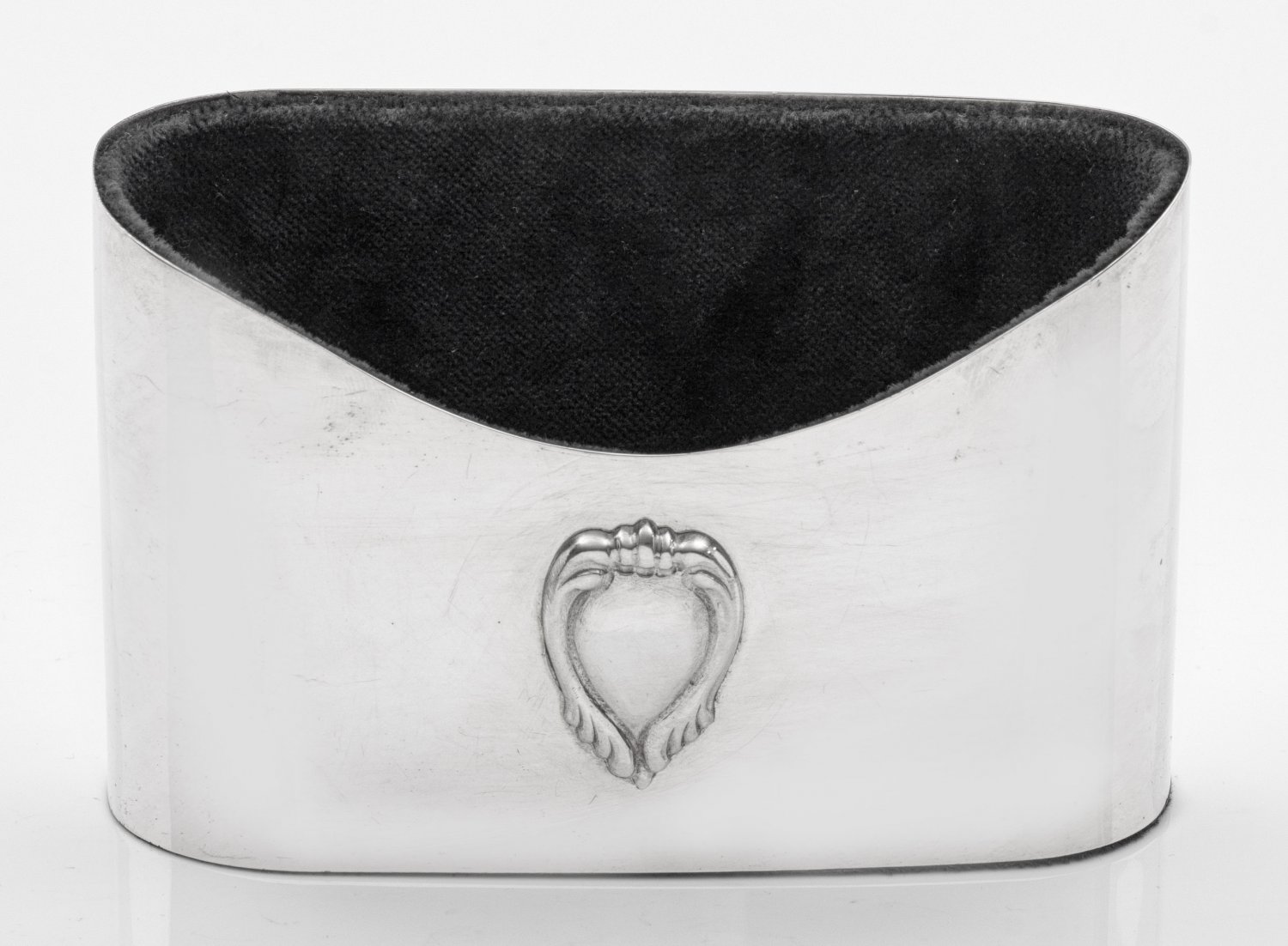 Schreibtischbox Silber. Hochrechteckig mit ovaler Bodenfläche und gerundeten Seiten. Nach oben hin geöffnet. Schauseitig mit vertieftem Rand und applizierter, reliefplastisch volutierter Kartusche. Innen und auf der Unterseite mit dunkelgrünem Samt bezogen. Gest. 800. Gew. ca. 175 g. H. 9 cm. 14 cm x 5,2 cm.