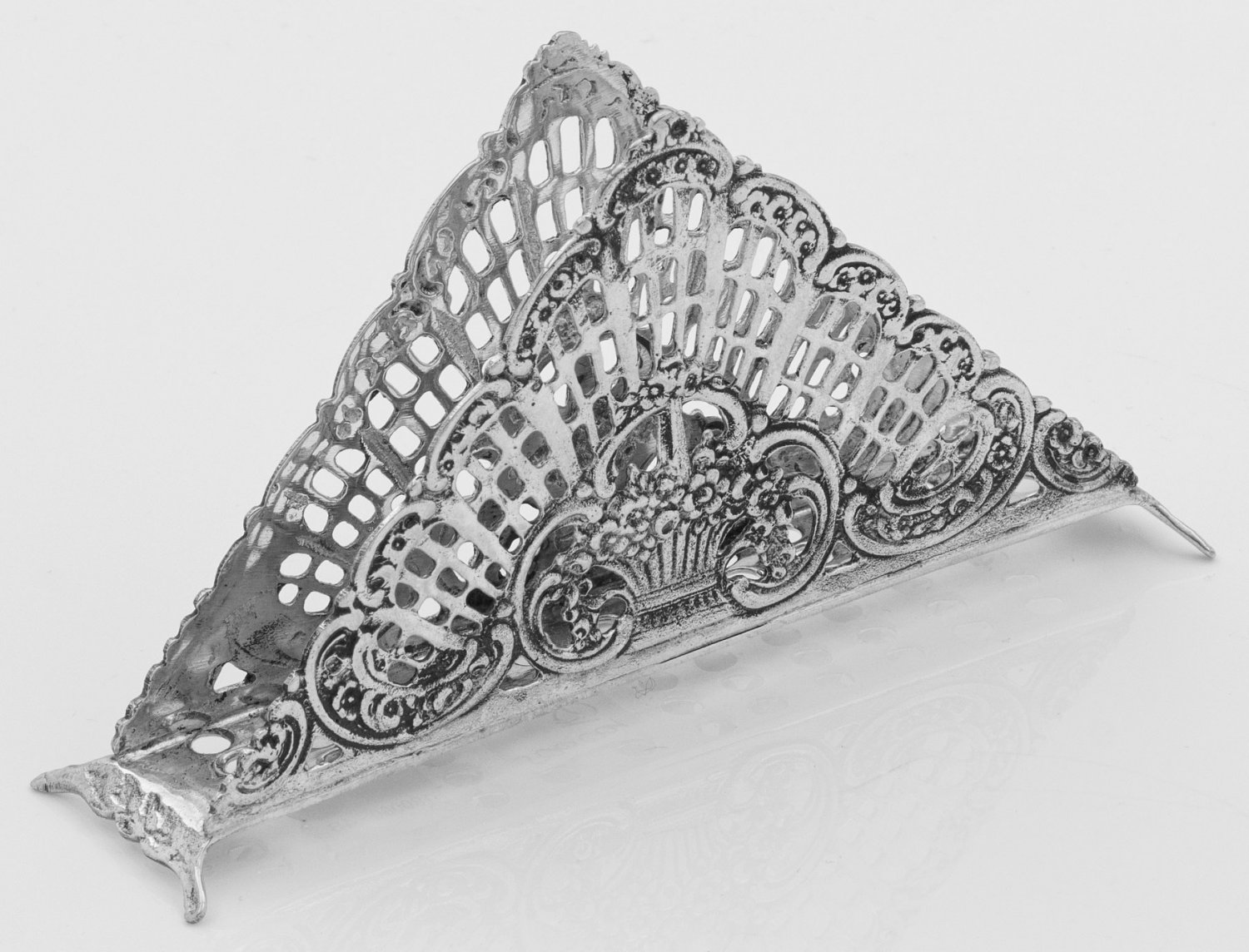 Serviettenhalter im Rokokostil Silber. Dreieckig mit netzgitterartig sowie in Form eines Blütenkorbes durchbrochen gearbeiteter Wandung. Gest. 800. Gew. ca. 105 g. 7,2 cm x 14,3 cm. A German Rococo style silver napkin holder. Standard mark 800. Deutsch. 20. Jh.