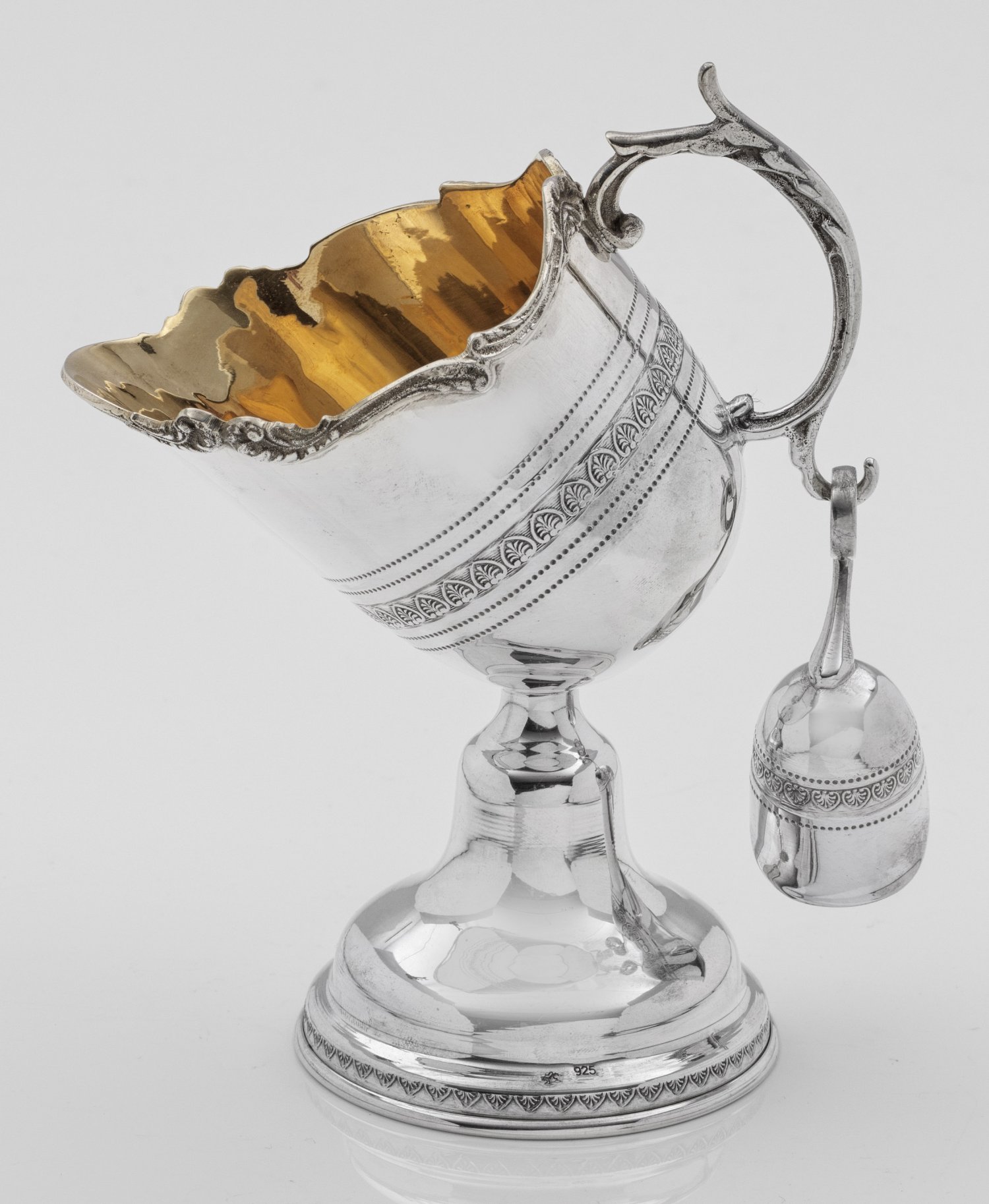 Zuckerschale Silber. Glockenförmiger Stand, übergehend in schräggestellten Korpus mit passig geschweiftem, volutenreliefiertem Rand. Volutenhenkel, daran Zuckerschaufel. Innen vergoldet. Gest. 925. Gew. ca. 210 g. H. 17 cm.