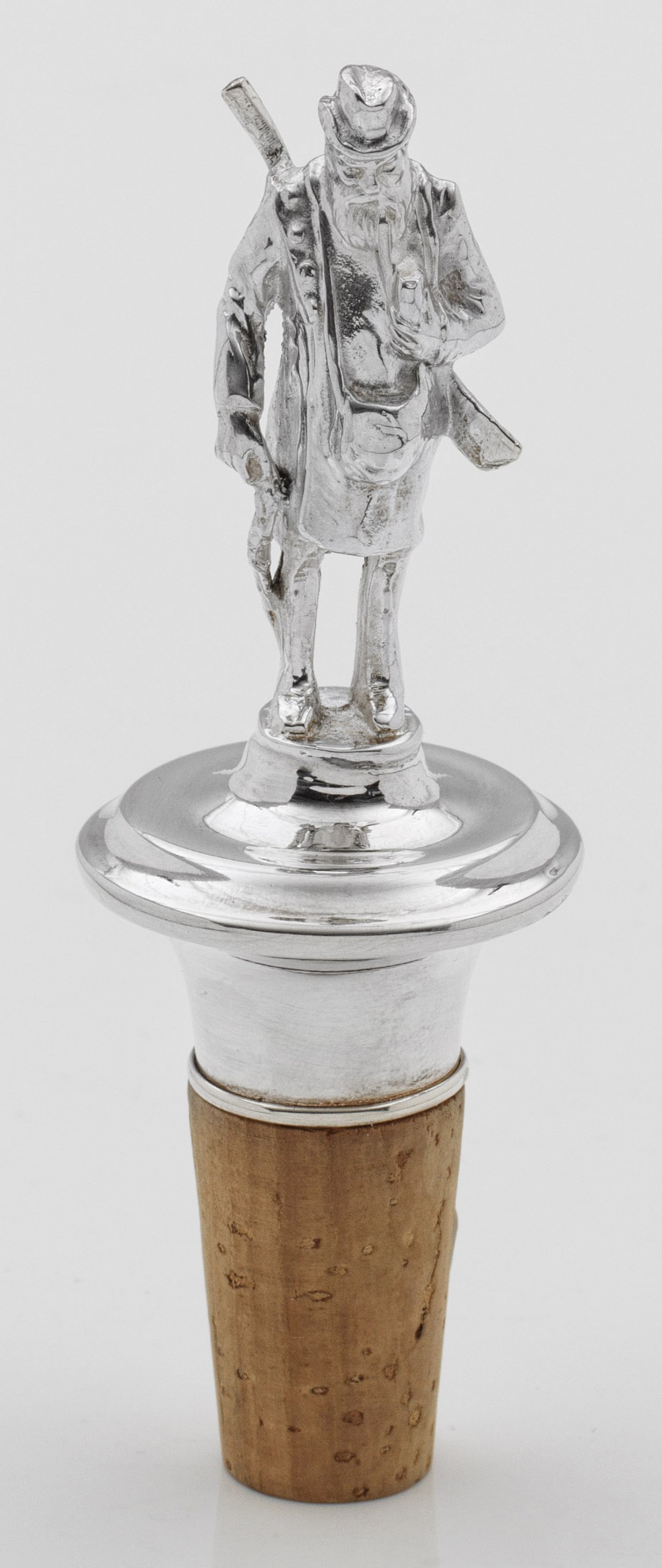 Flaschenkorken mit Silbermontierung. Vollplastisch gestalteter Griff in Gestalt eines Jägers. Gest. 925. Ges.-H. ca. 12 cm.A Sterling silver mounted bottle cork with a hunter. Standard mark 925.Sterling-Silber. 20. Jh.