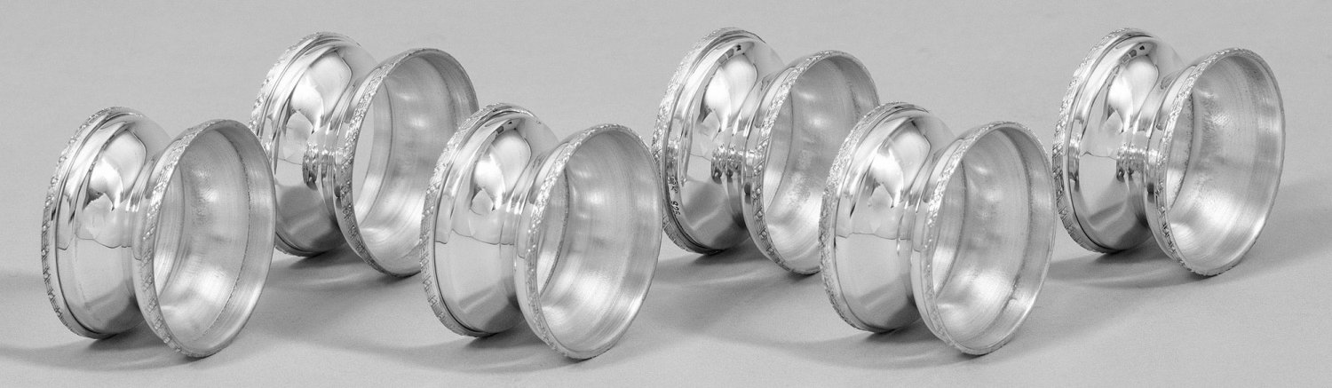 Sechs Serviettenringe Silber. Rund mit eingezogener Wandung, an den Rändern umzogen von Banddekor. Gest. 925. Gew. zus. ca. 120 g. D. 4,5 cm.Six Sterling silver napkin rings. Standard mark 925.Sterling-Silber. 20. Jh.
