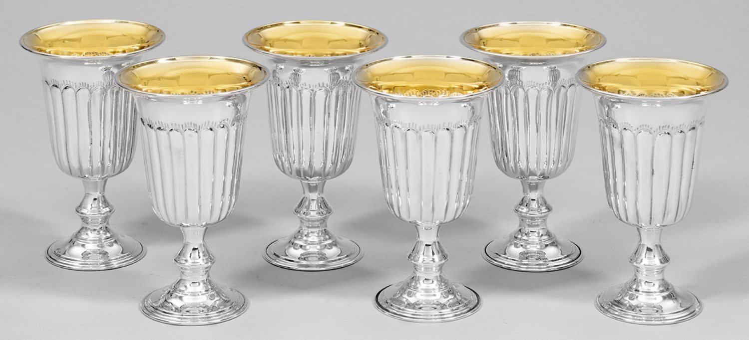 Sechs Weinpokale Silber. Über kurzem Balusterschaft ausschwingende, kannelierte Kuppa. Innen vergoldet. Gest. 925. Gew. zus. ca. 920 g. H. 13,5 cm.Six Sterling silver wine goblets. Gilt inside. Standard mark 925.Sterling-Silber. 20. Jh.