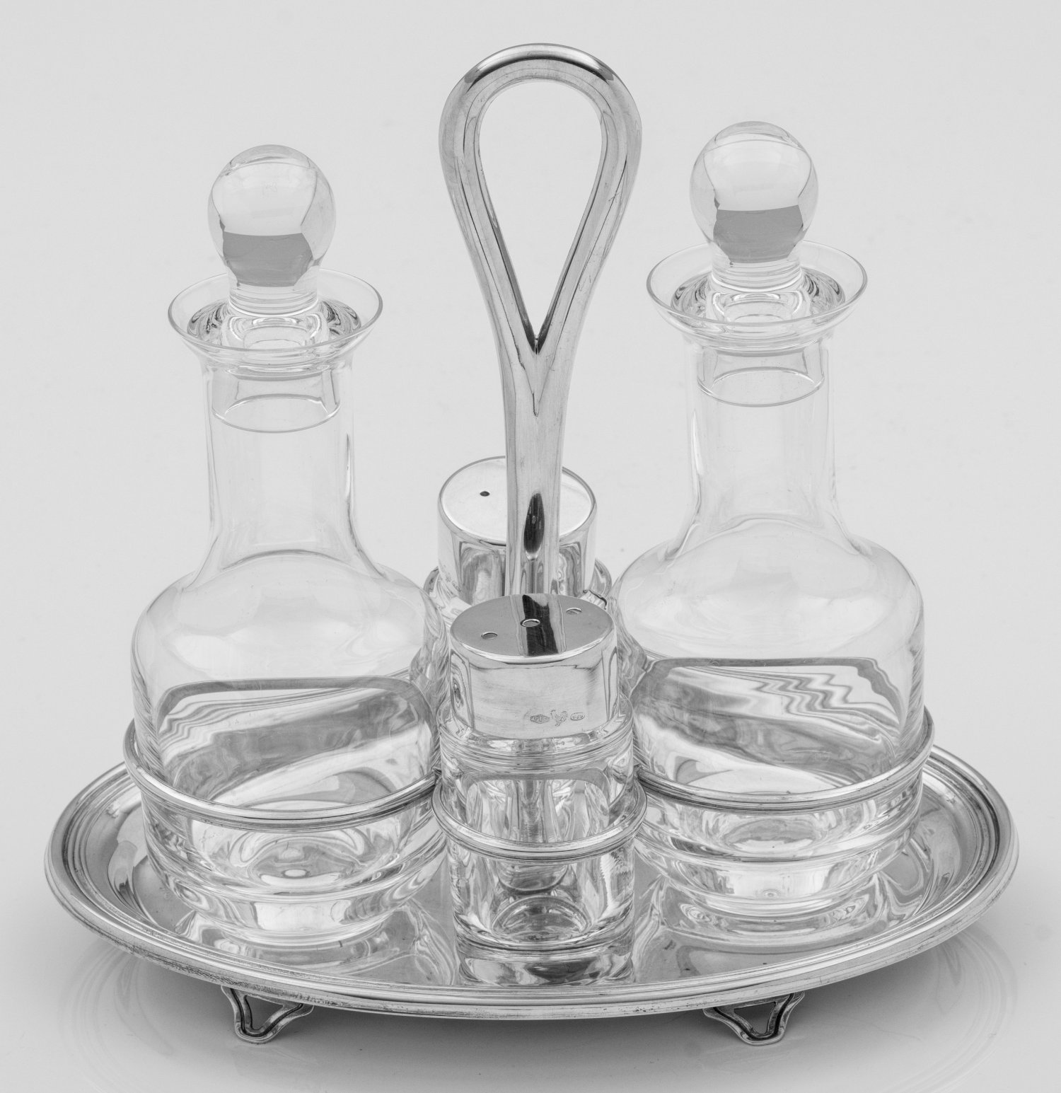 Menage Silber. 5-tlg.; Ovaler Stand mit profiliertem Rand, mittig aufsteigender, ovaler Griff. Unterhalb vier Halteringe für Essig- und Ölflasche sowie Pfeffer- und Salzstreuer aus farblosem Glas, teilw. mit Silbermontierung. Gest. 925 bzw. 800, Herstellerzeichen. H. 20 cm.