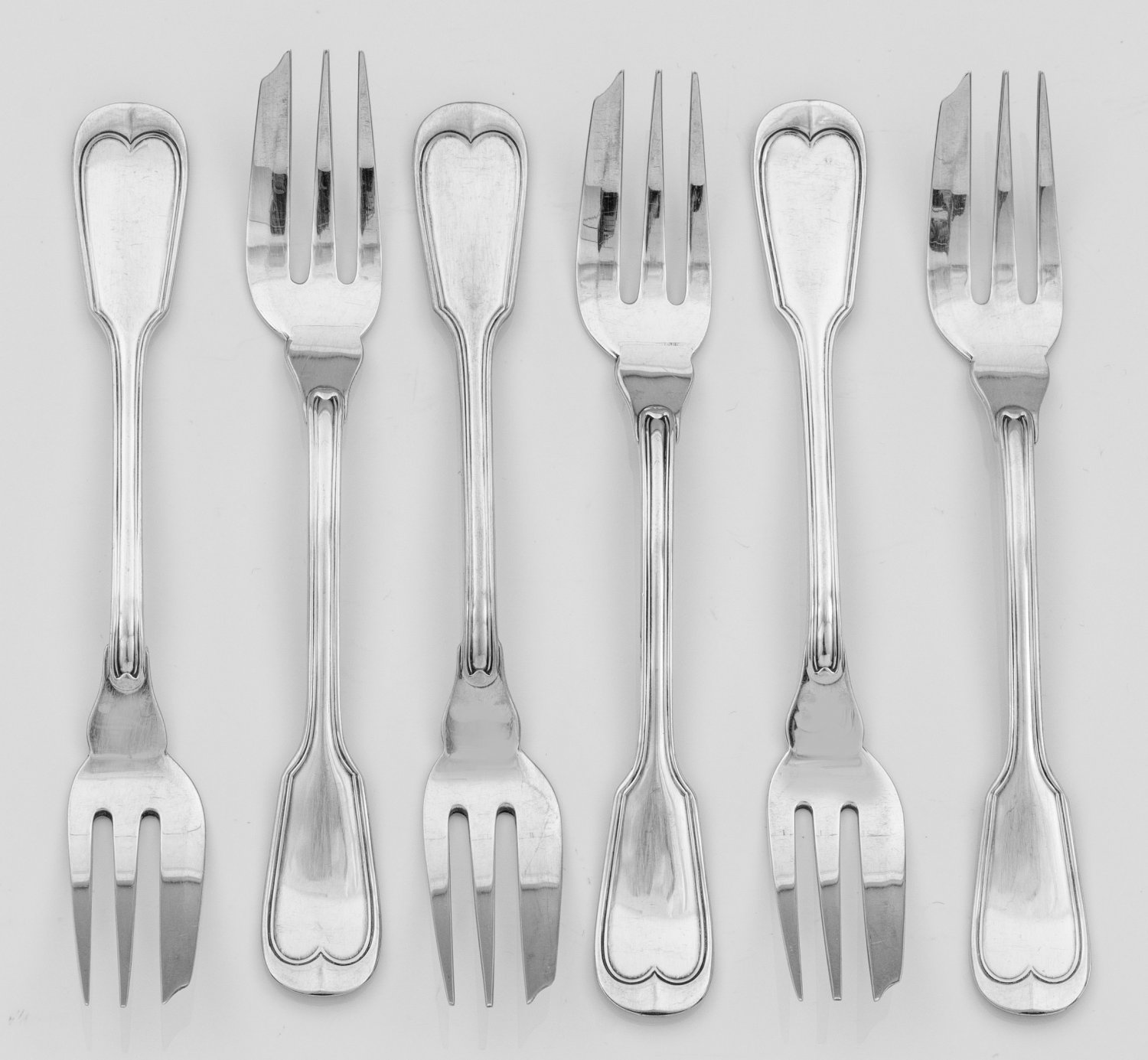 Kuchengabeln Silber. 6-tlg.; Dreizinkige Gabel mit flachem, profiliertem Griff. Modell Augsburger Faden. Gest. 925, Herstellerzeichen. Gew. zus. ca. 140 g. L. 14 cm.