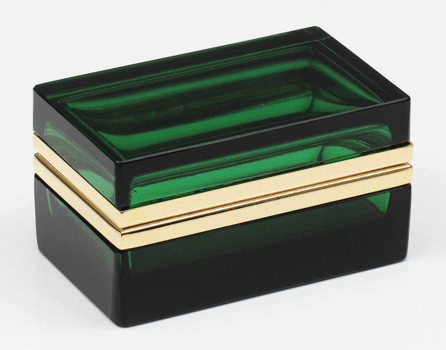 Art Déco-Dose Rechteckig. Transparentes flaschengrünes Glas, geschliffen und poliert. Scharnierte Messingmontierung. H. 6 cm. 11 cm x 6,5 cm. A French Art Deco cut and polished bottle green glass box with brass-mounted hinged cover. Frankreich. Um 1935-1940.