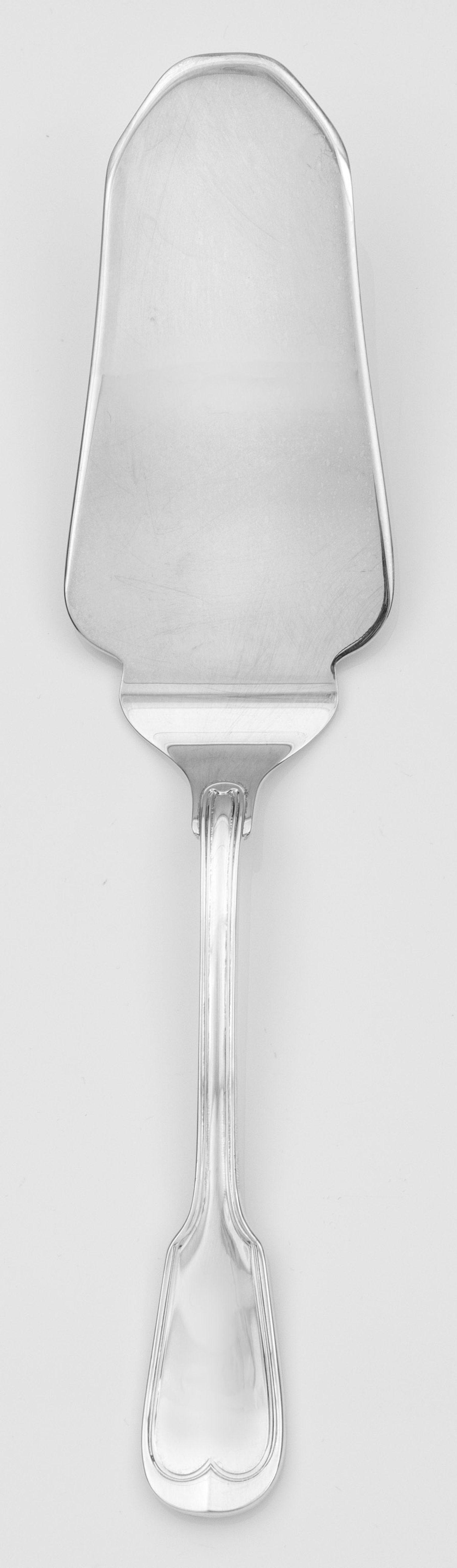 Tortenheber Silber. Geschweifter Heber. Flacher, randprofilierter Griff. Modell Augsburger Faden. Gest. 800. Gew. ca. 155 g. L. 26 cm.A German silver cake lifter. Standard mark 800. Deutsch. 20. Jh.