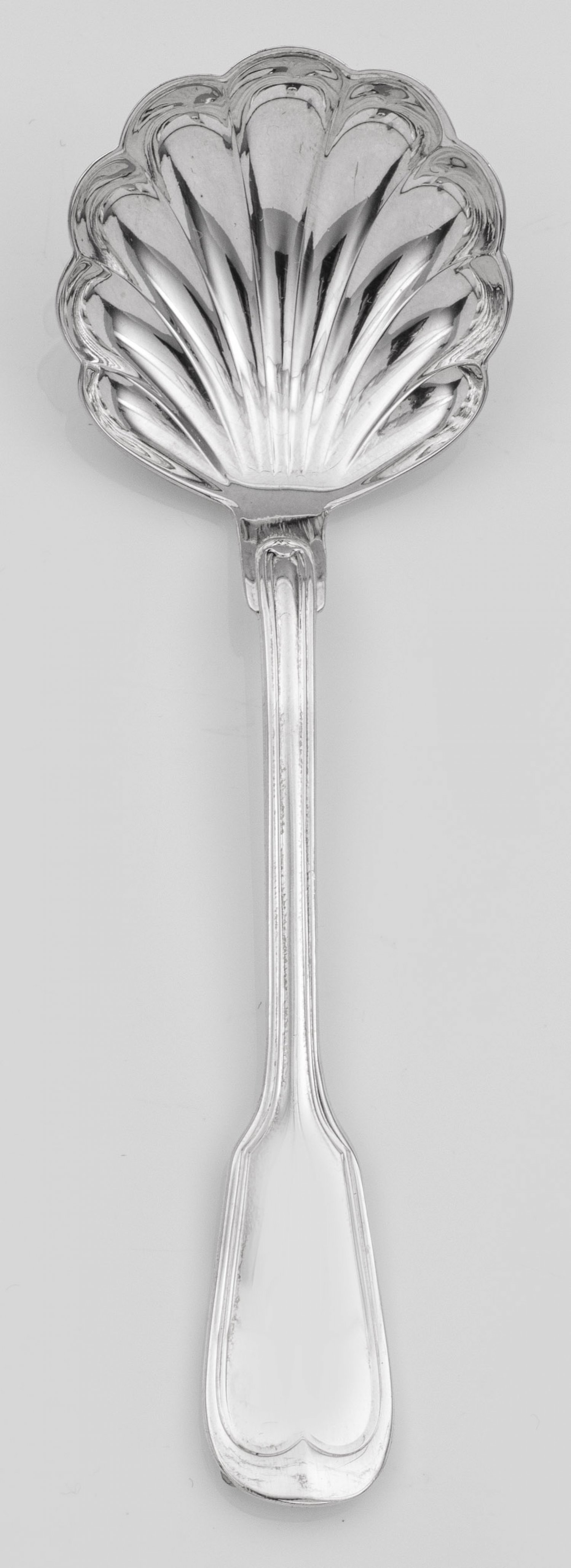 Zuckerlöffel Silber. Muschelförmige Laffe, übergehend in randprofilierten Griff. Modell Augsburger Faden. Gest. 925. Gew. ca. 25 g. L. 12 cm.A Sterling silver sugar spoon. Standard mark 925.Sterling-Silber. 20. Jh.