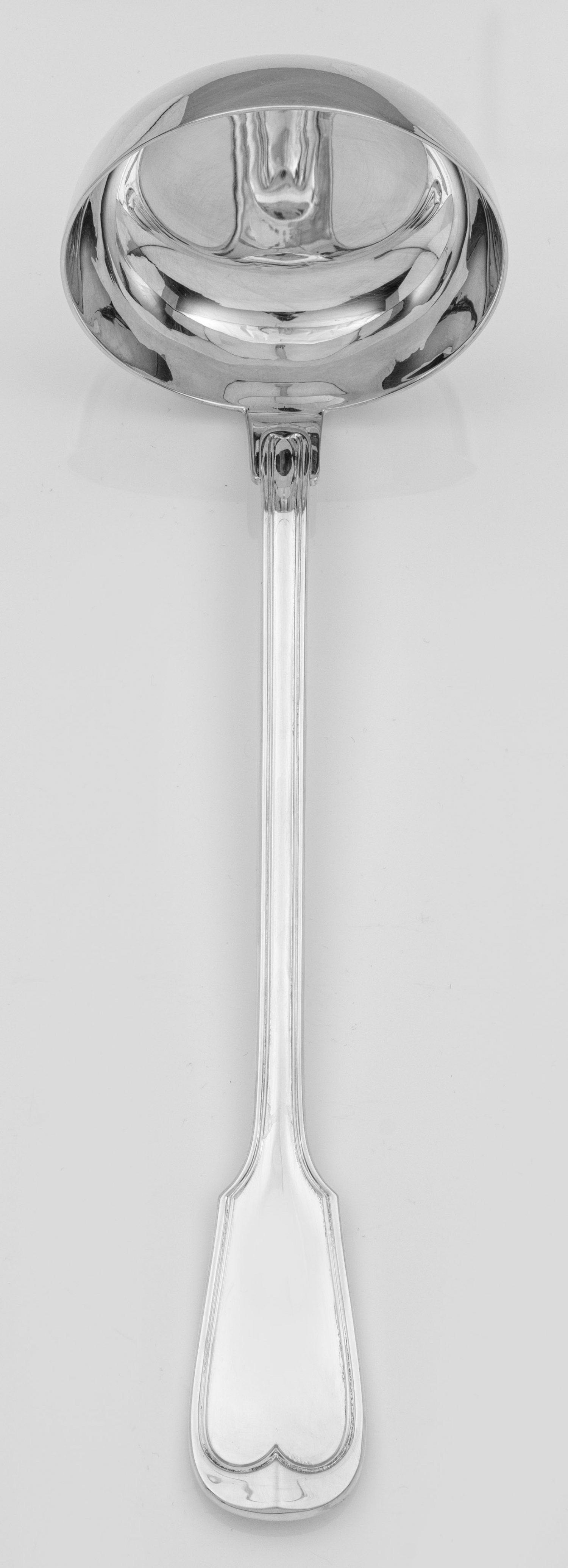 Suppenkelle Silber. Runde, tief gemuldete Laffe, übergehend in randprofilierten, flachen Griff. Modell Augsburger Faden. Gest. 800. Gew. ca. 310 g. L. 28 cm.A German silver soup ladle. Standard mark 800.Deutsch. 20. Jh.