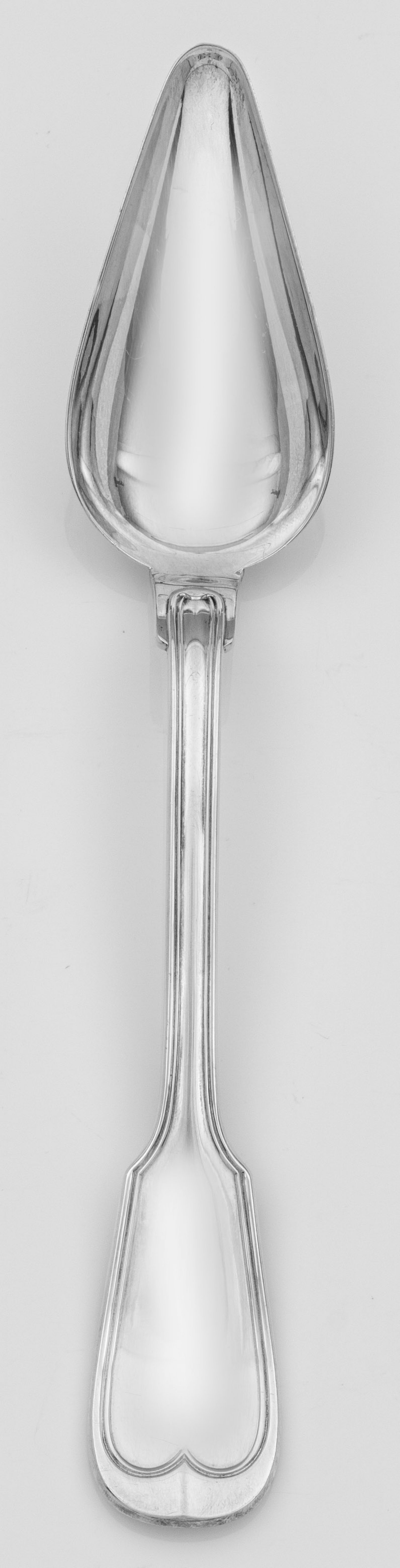 Saucen-Probierlöffel Silber. Spitz zulaufende Laffe, übergehend in flachen, randprofilierten Griff. Gest. 925, Herstellerzeichen. Gew. ca. 125 g. L. 24,5 cm. An Italian silver tasting spoon by Bruno e Cesare Zaramella. Standard mark 925, maker´s mark. Italien. Padua. Bruno e Cesare Zaramella. 20. Jh.