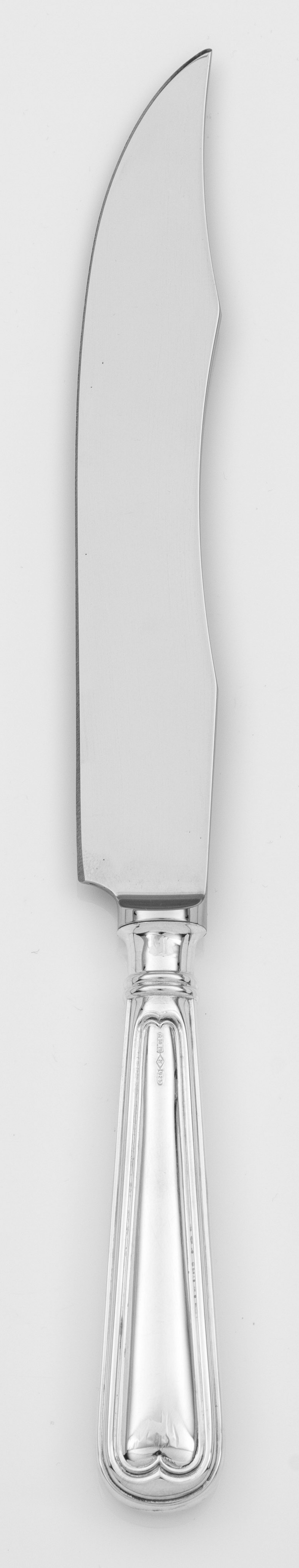 Tranchiermesser Silber und Edelstahl. Passig geschweifte, spitz zulaufende Klinge mit randprofiliertem Griff. Modell Augsburger Faden. Gest. 925, Herstellerzeichen. L. 32 cm. An Italian silver and stainless steel carving knife. Standard mark 925, maker´s mark. Italien. Padua. 20. Jh.