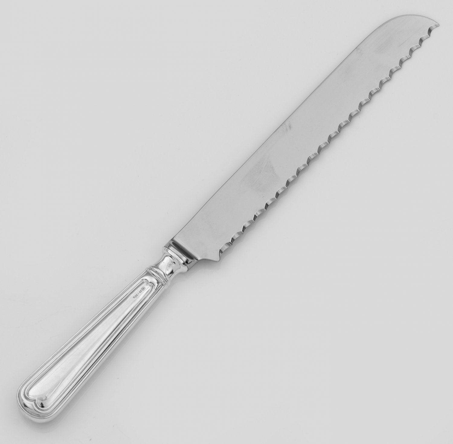 Brotmesser Silber und Edelstahl. Randprofilierter Griff. Modell Augsburger Faden. Gest. 800. L. 29 cm.A German silver and stainless steel bread knife. Standard mark 800.Deutsch. 20. Jh.