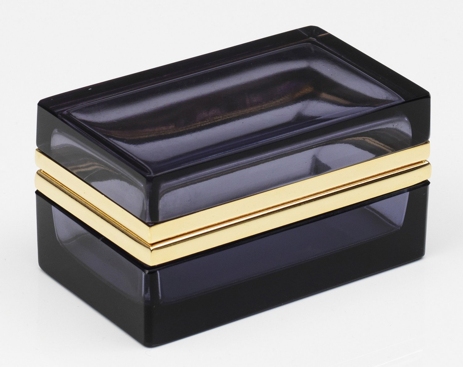 Art Déco-Dose Rechteckig. Transparentes amethystfarbenes Glas, geschliffen und poliert. Scharnierte Messingmontierung. H. 6 cm. 11 cm x 6,5 cm. A French Art Deco cut and polished dark violet glass box with brass-mounted hinged cover. Frankreich. Um 1935-1940.