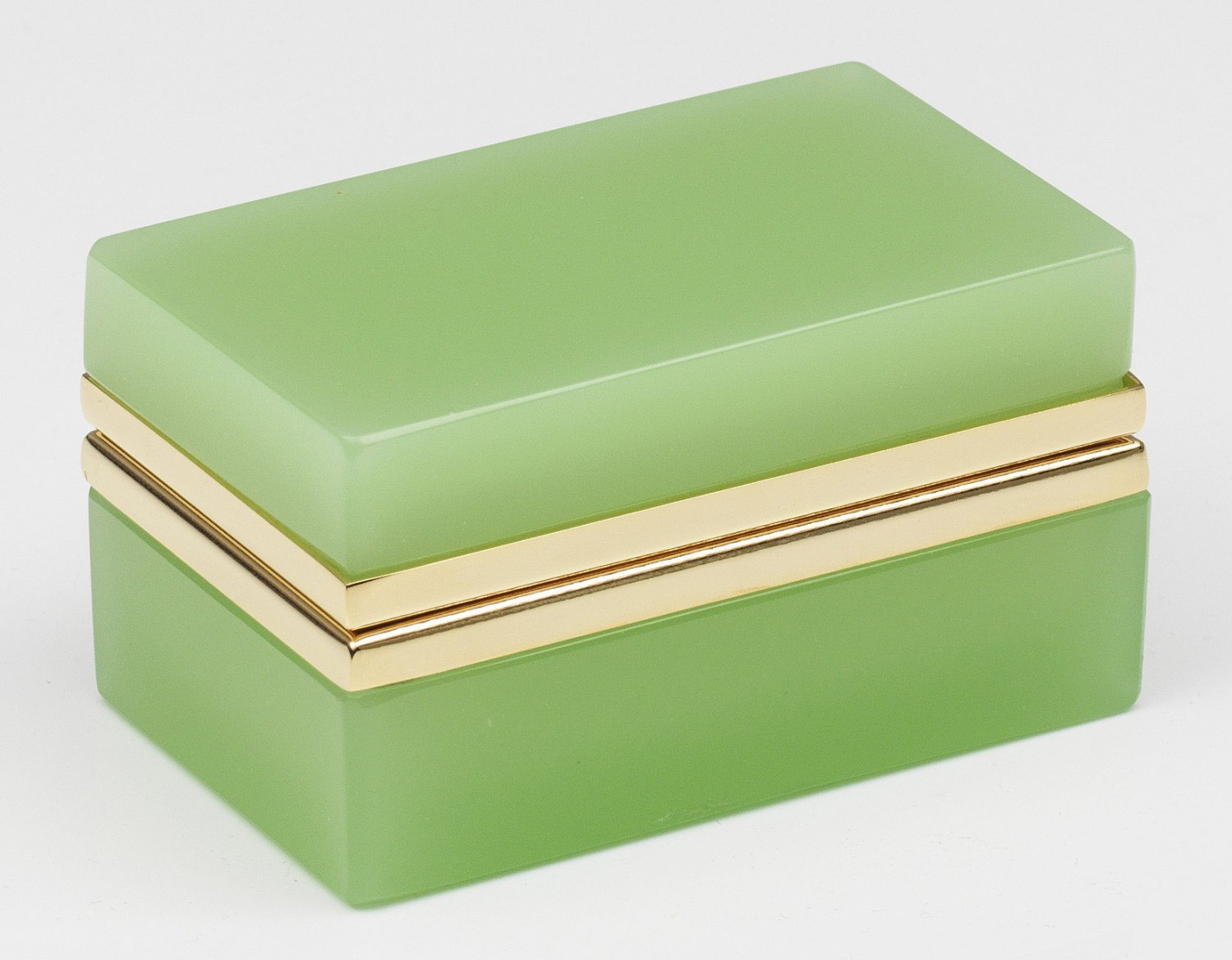 Art Déco-Dose Rechteckig. Geschliffenes und poliertes, helllindgrünes Opalglas. Scharnierte Messingmontierung. Altersbedingte Gebrauchsspuren. H. 6 cm. 11 cm x 6,5 cm.