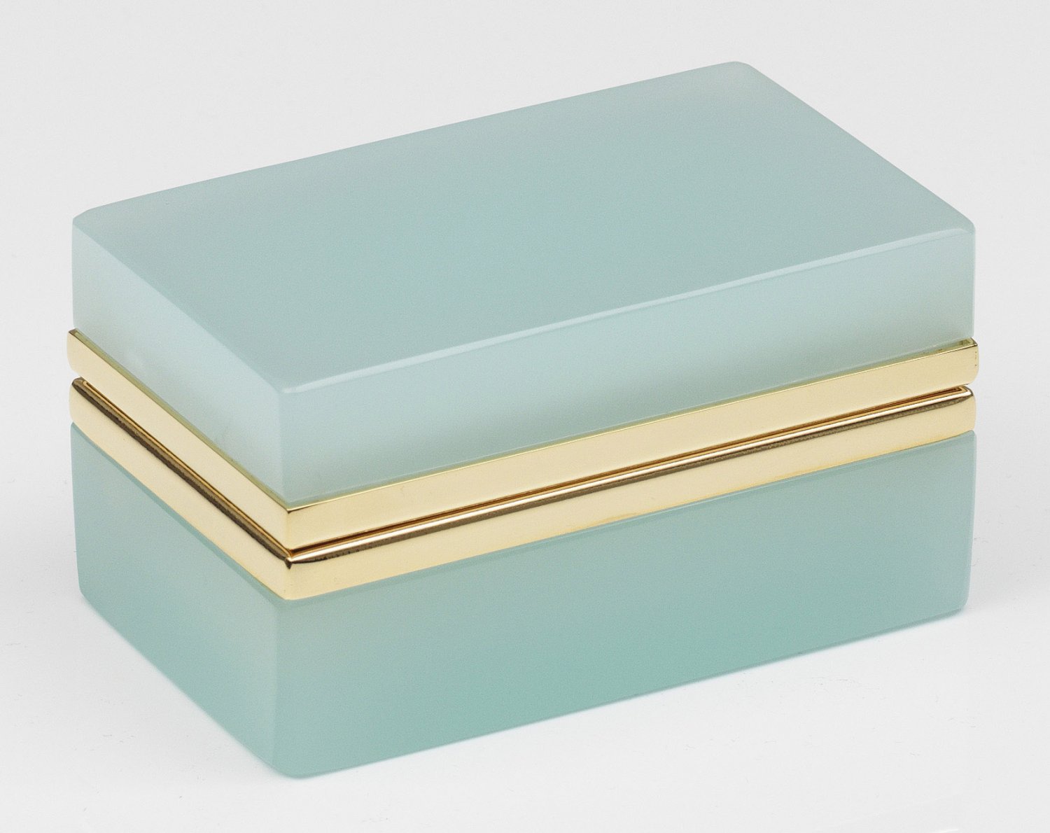 Art Déco-Dose Rechteckig. Helltürkisblaues, geschliffenes und poliertes Opalglas. Scharnierte Messingmontierung. H. 6 cm. 11 cm x 6,5 cm. A French Art Deco cut and polished light turquoise blue glass box and brass-mounted hinged cover. Frankreich. Um 1935-1940.
