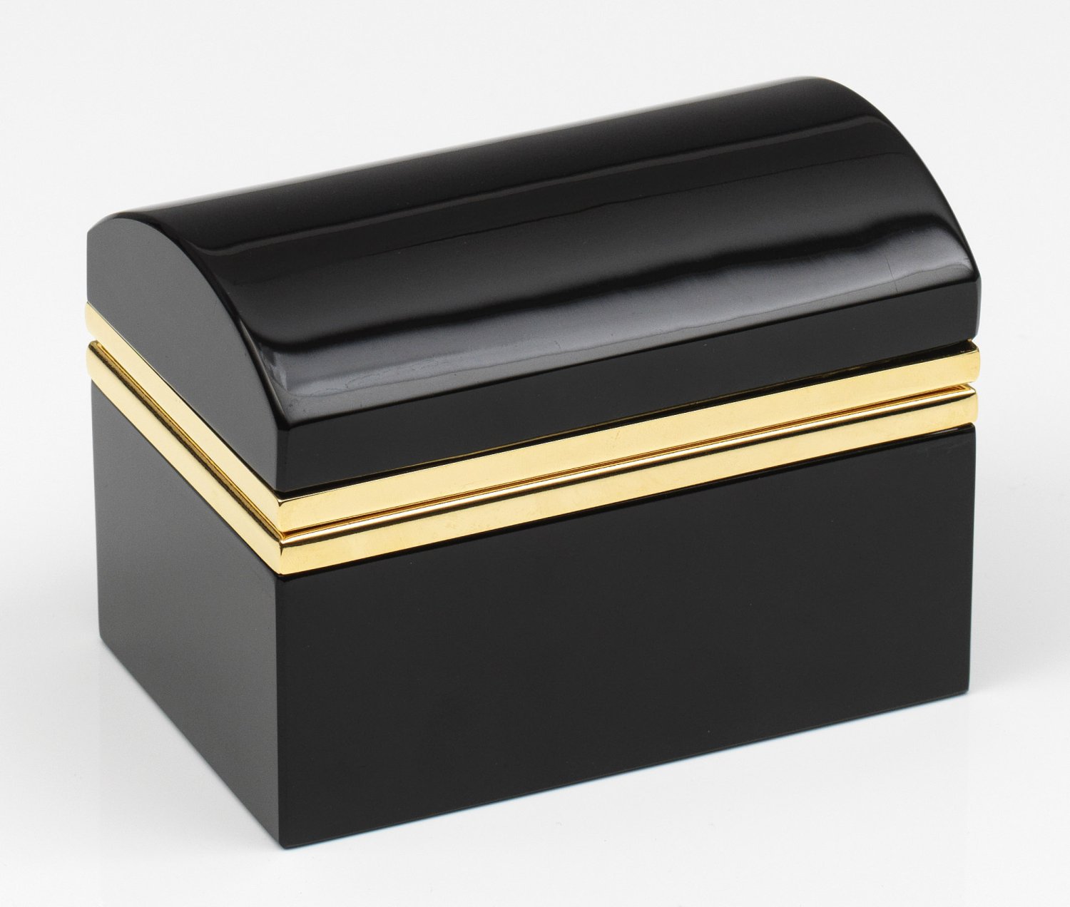 Art Déco-Dose Truhenform mit rund gewölbtem Deckel. Schwarzes Opalglas, geschliffen und poliert. Scharnierte Messingmontierung. Minim. Gebrauchsspuren. H. 9,7 cm. 13,3 cm x 8,3 cm.