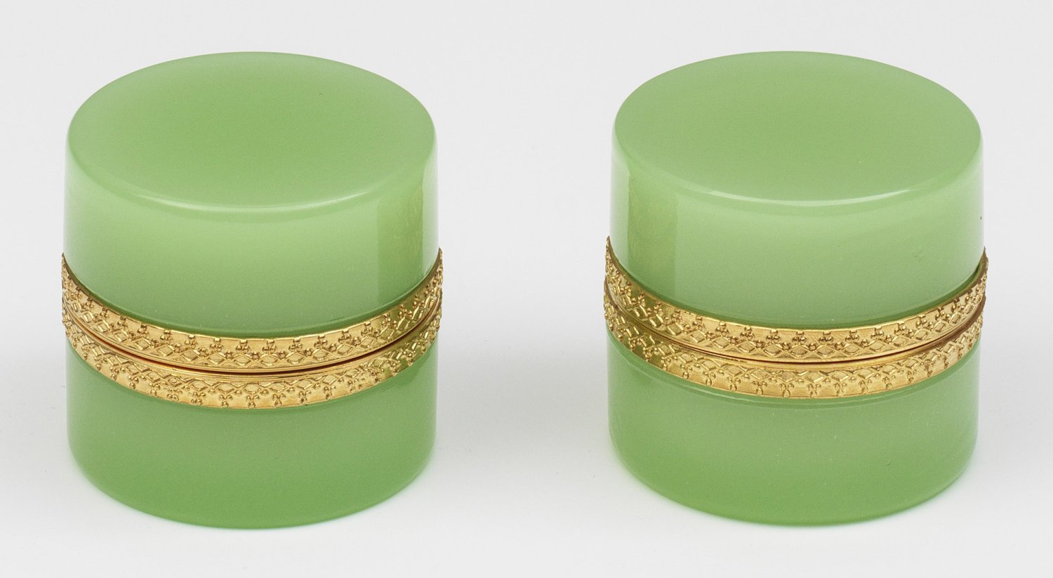 Paar Art Déco-Dosen Zylindrisch. Helllindgrünes Opalglas, geschliffen und poliert. Scharnierte Messingmontierung mit reliefierter Ornamentbordüre. H. 5,5 cm. A pair of French Art Deco cut light lime green glass boxes with brass-mounted hinged cover. Frankreich. Um 1935-1940.