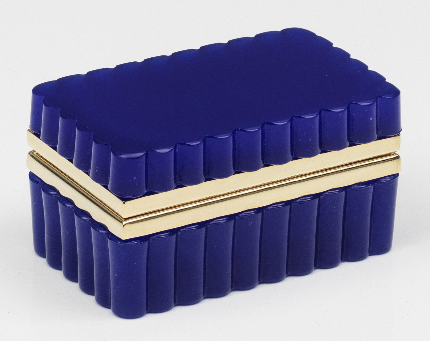 Art Déco-Dose Rechteckig, abgeschrägte Ecken. Dunkelblaues, geschliffenes und poliertes Opalglas mit gewellter bzw. gerippter Wandung. Scharnierte Messingmontierung. H. 6 cm. 11 cm x 6,8 cm.