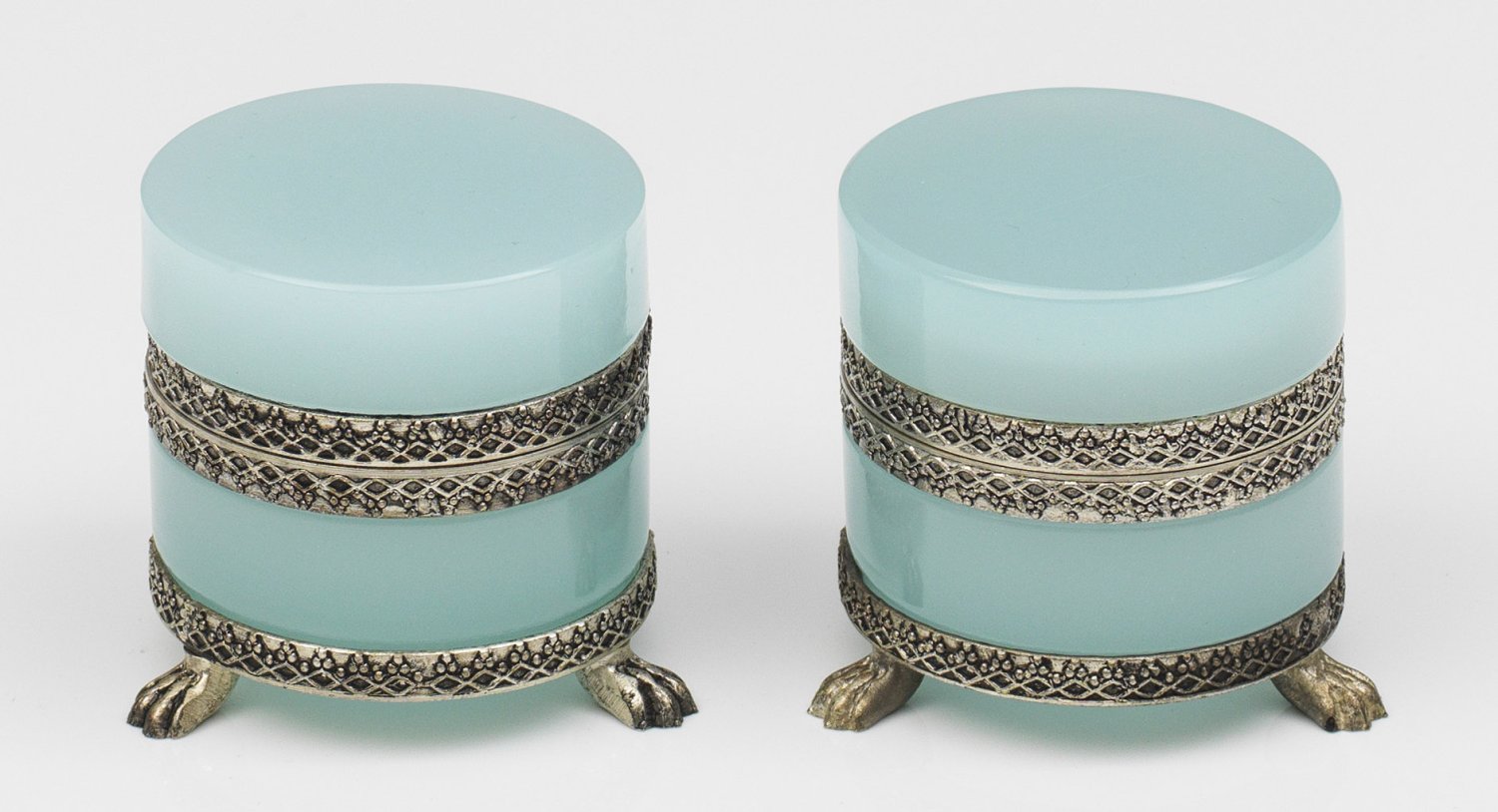 Paar Zierdosen Zylindrisch. Von je drei Tatzenfüßen getragener Korpus. Helltürkisblaues Opalglas, geschliffen und poliert. Scharnierte Metallmontierung mit reliefierter Ornamentbordüre. H. 5,7 cm.