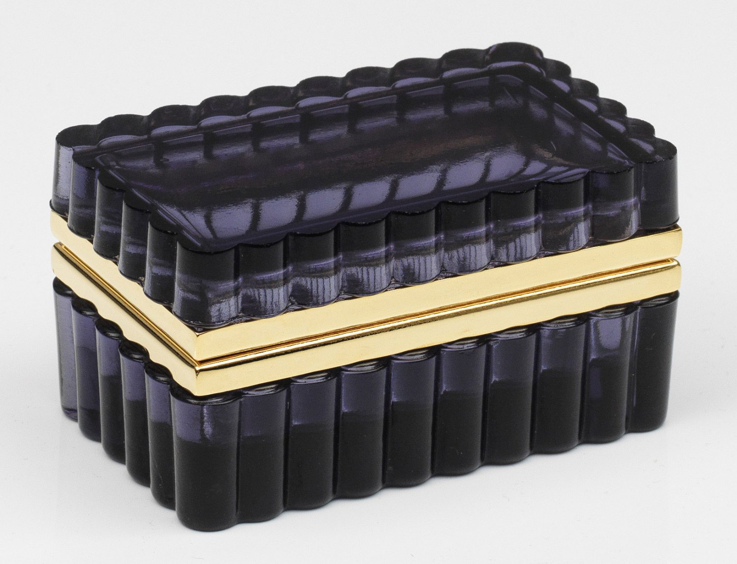 Art Déco-Dose Rechteckig, abgeschrägte Ecken. Transparentes amethystfarbenes Glas mit gewellter bzw. gerippter Wandung. Scharnierte Messingmontierung. H. 6,2 cm. 11,2 cm x 6,8 cm. A French Art Deco corrugated dark violet glass box and brass-mounted hinged cover. Frankreich. Um 1935-1940.