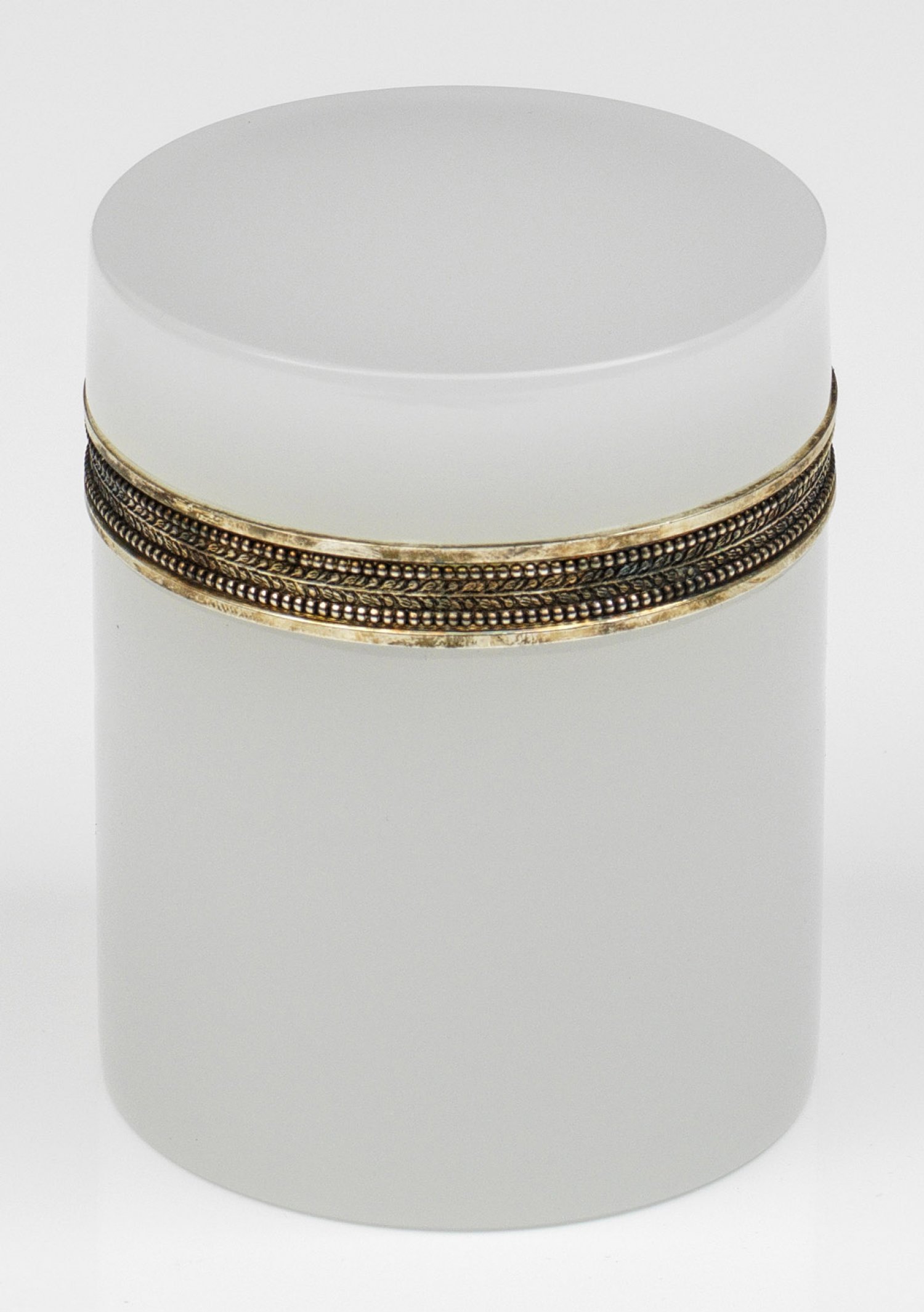Art Déco-Dose Zylindrisch. Weißes Opalglas, geschliffen und poliert. Metallmontierung mit reliefierter Ornamentbordüre. H. 11,5 cm.A French Art Deco cut and polished white glass box with metal mounting.Frankreich. Um 1935-1940.