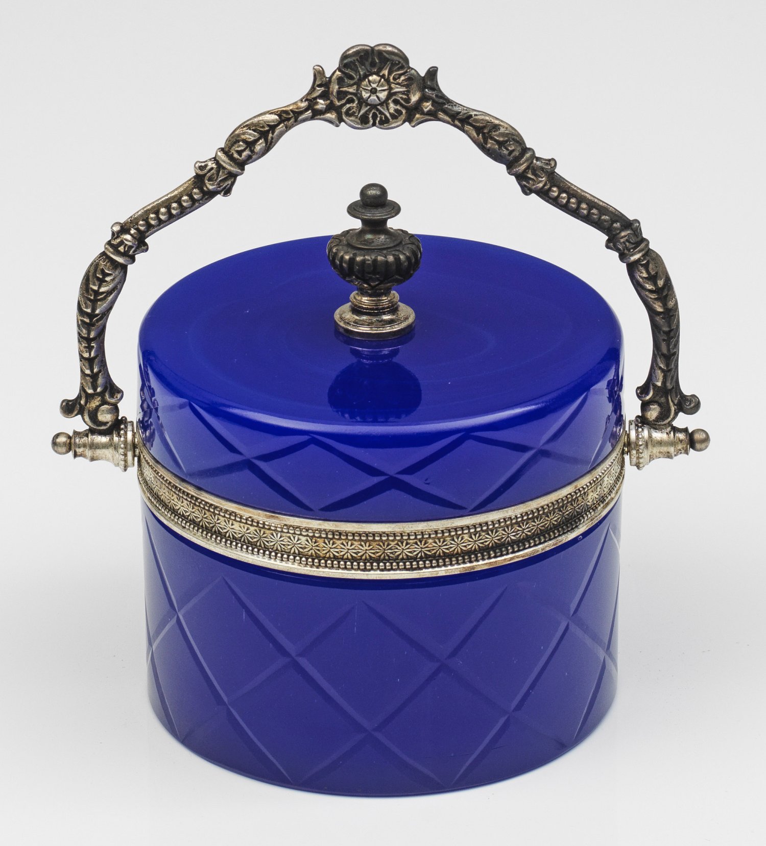 Eleganter Eiswürfelbehälter Zylindrisch. Dunkelblaues Opalglas, geschliffen und poliert. Metallmontierung mit reliefierter Ornamentbordüre und beweglichem Henkel mit Rosetten- und Akanthusrelief. Der Deckel mit vasenförmigem Knauf. Altersbedingte Gebrauchsspuren. H. 14,5 cm. D. 12 cm.