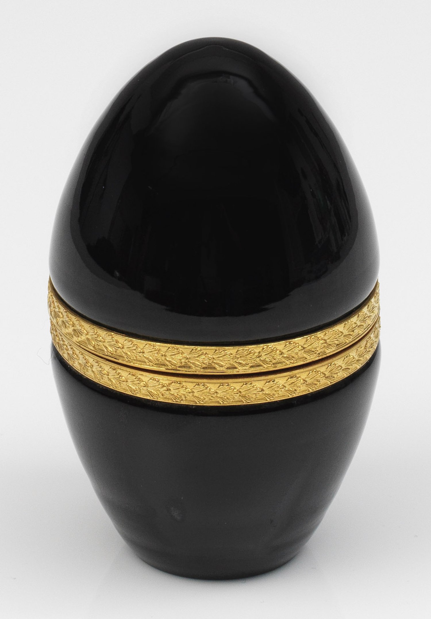 Zierdose in Eiform Schwarzes Opalglas, geschliffen und poliert. Scharnierte Messingmontierung mit reliefierter Ornamentbordüre. H. 12 cm.A French Art Deco cut egg-shaped black glass box with brass-mounted hinged cover. Frankreich. Um 1935-1940.