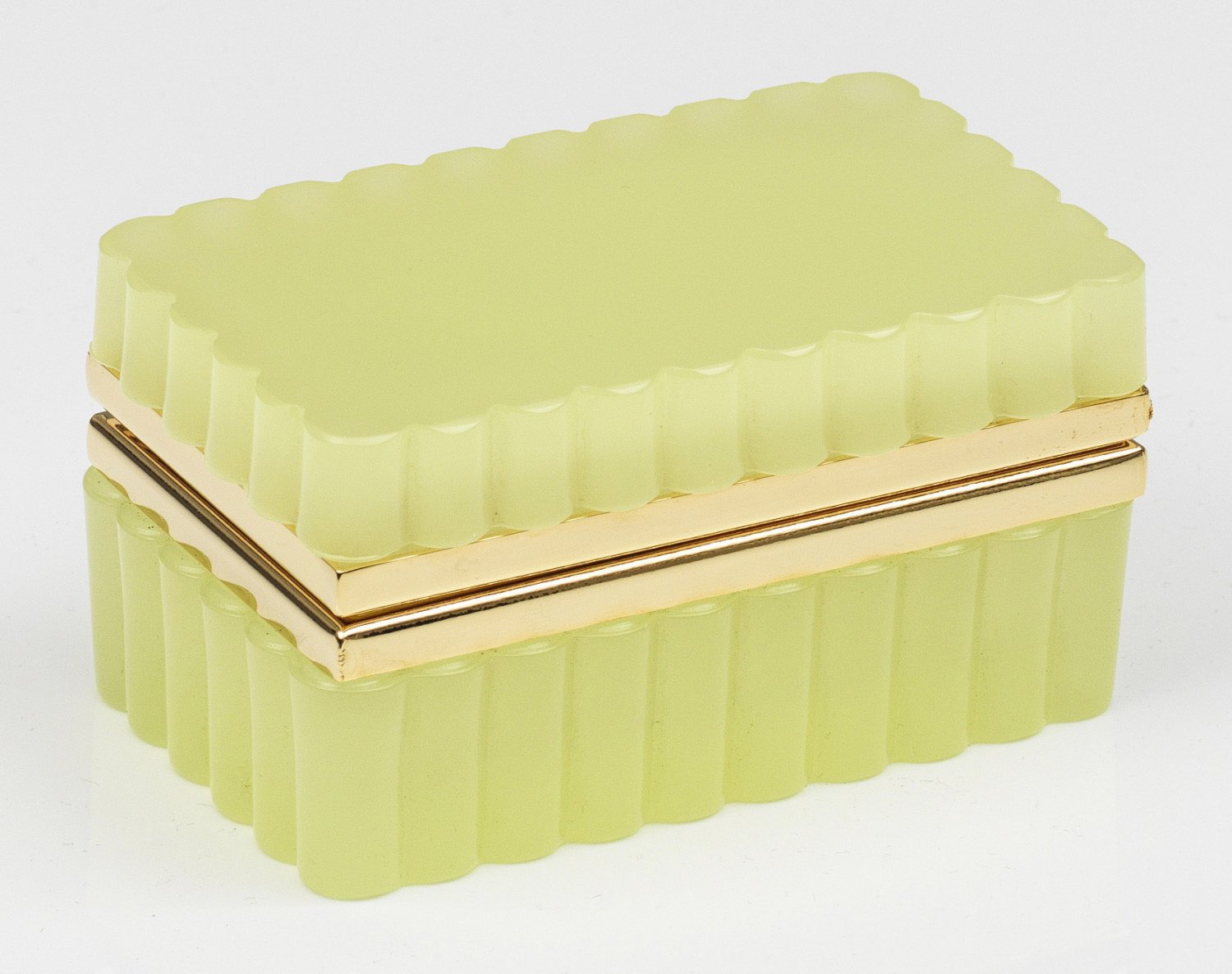 Art Déco-Dose Rechteckig, abgeschrägte Ecken. Gelbgrünes bzw. limettengrünes, geschliffenes und poliertes Opalglas mit gewellter bzw. gerippter Wandung. Scharnierte Messingmontierung. H. 6 cm. 11 cm x 6,8 cm.